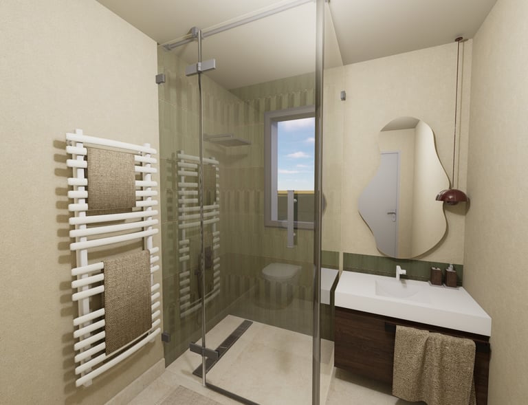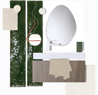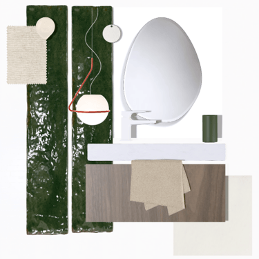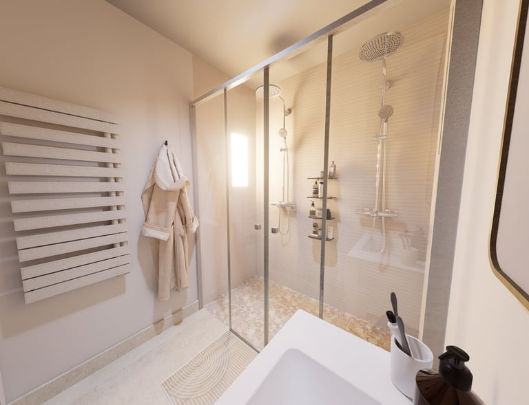 Modélisation d’une salle d’eau aux tons beiges afin d’illuminer la pièce, associée à du zellige vert et à un sol effet travertin.