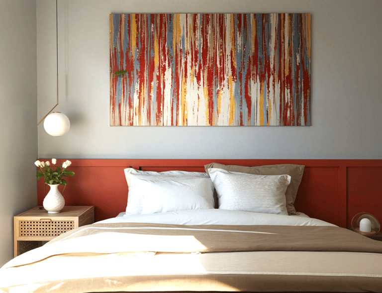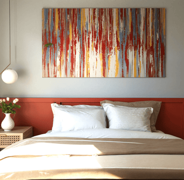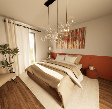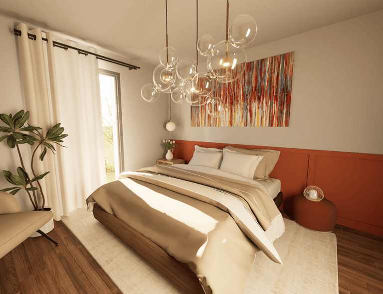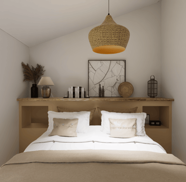 La palette chromatique s’articule autour de nuances ocre, associées à des matériaux naturels tels que le bois, apportant chaleur et confort dans la chambre.