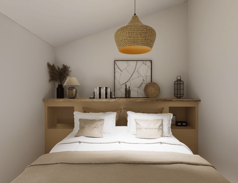 La tête de lit intégrée structure l’espace tout en apportant du caractère à la pièce.