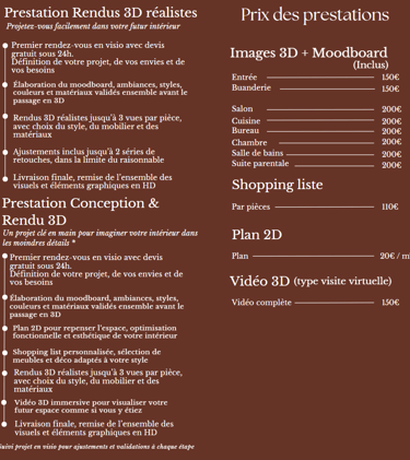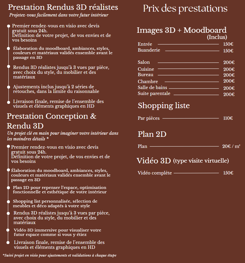 Les rendus 3D sont fournis uniquement à titre indicatif et de présentation. Ils ne constituent en aucun cas des plans techniques destinés à l’exécution de travaux. Des différences peuvent exister entre le rendu visuel et la réalisation finale (dimensions, couleurs, matériaux, textures, éclairage, etc.), sans que la responsabilité de l’architecte d’intérieur ne puisse être engagée.